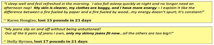 | How Can I Be SURE This is the Right Program For ME? Well, the fact is, this program is SCIENTIFICALLY-BASED & PROVEN TO WORK for regular folks (meaning you don't have to be some hard-core athlete or professional that works out all day) just like you and me. So far over 2000 people have successfully gone through the 21-day Detox program. The feedback has been phenomenal. |
