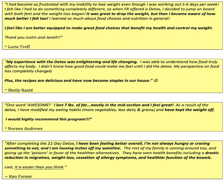 | They’ve got files full of testimonials just like these, but you get the point. BOTTOM LINE: The 21-Day Detox Challenge is hands-down THE BEST way for you to look and feel great about/in your body! That’s why I’ve partnered with them to bring YOU the 21-Day Detox Challenge! Look, if you know me, you know I don’t mess around. If I’m going to deliver a program to my clients, I’m only going to bring you the very best. That’s why I’m so excited to have this opportunity to work with Justin & Janell to bring their program to you. |